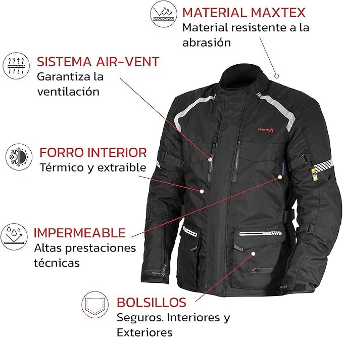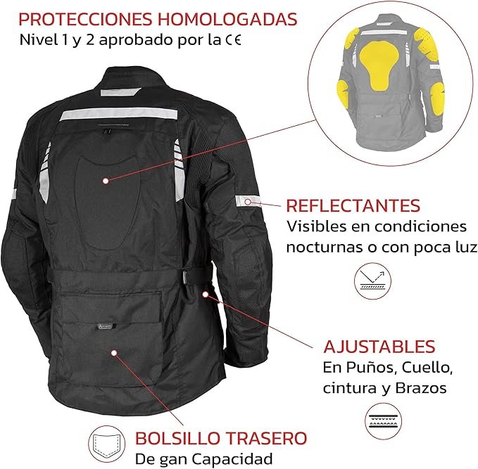 Todo ello la convierte en una chaqueta de moto touring cómoda y funcional.